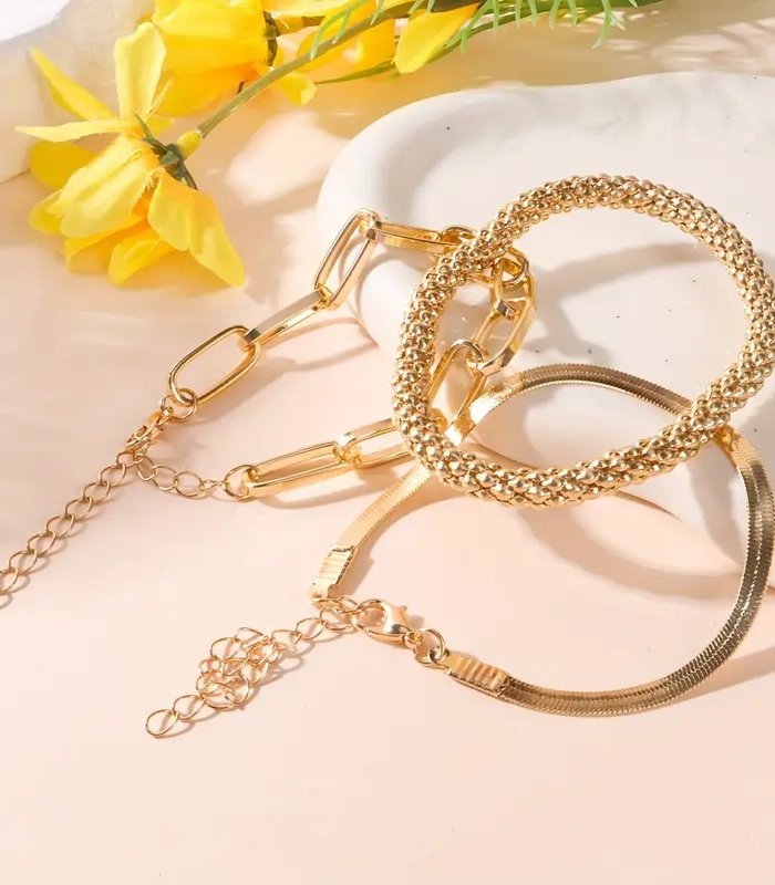 “3pcs Vintage Snake Bone Chain Bracelet Combo – Layered Metal Link Jewelry for Daily Wear & Parties”