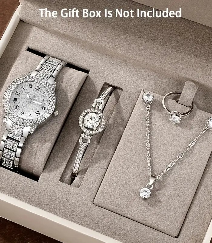 6pcs Golden Quartz Watch & Jewelry Set for Women – Elegant Necklace, Earrings, Bracelet, Ring & Gift Box