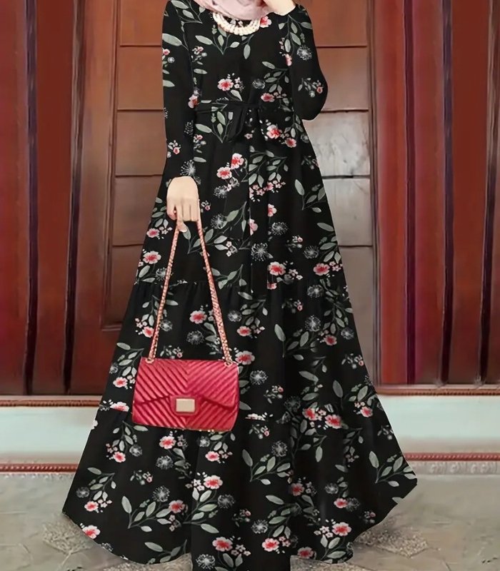 Women’s Elegant Floral Maxi Dress – Black with Red Flower Design, Lace-Up Front & Long Sleeves | Modest, Breathable & Stylish Outfit for All Seasons
