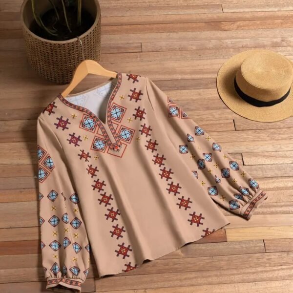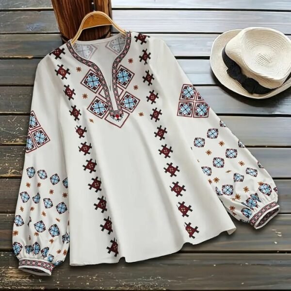 Women’s Ethnic Floral V-Neck Blouse – Lantern Sleeves, Lightweight Fabric & Casual Vacation Style | All-Season Elegant Top