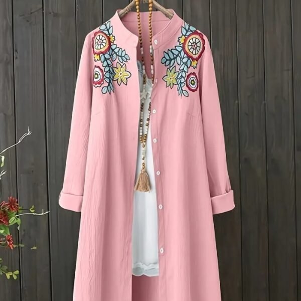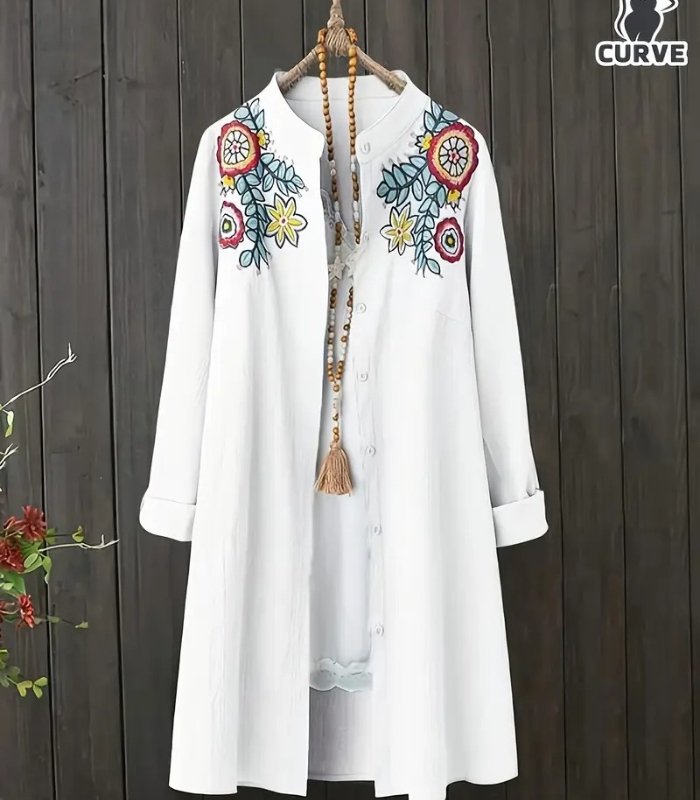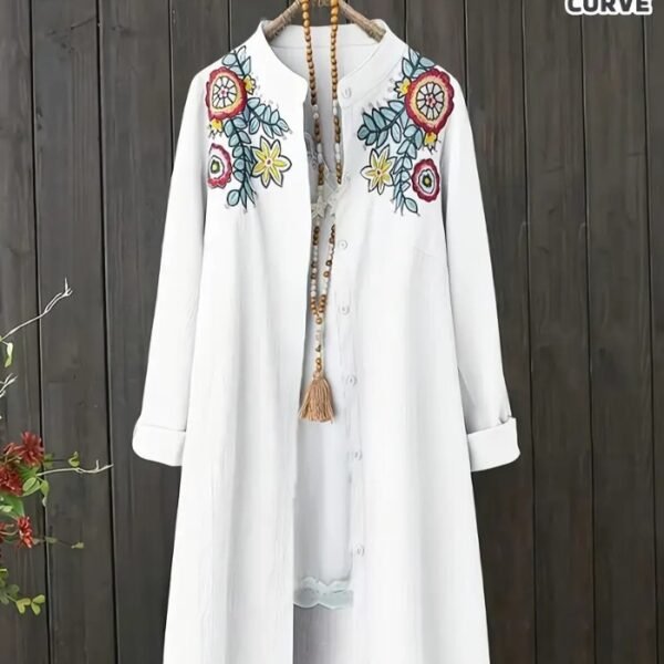 Women’s Plus Size Floral Embroidered Blouse – Elegant Longline Shirt with Stand Collar | Lightweight, Non-Stretch Fabric for Everyday & Formal Wear
