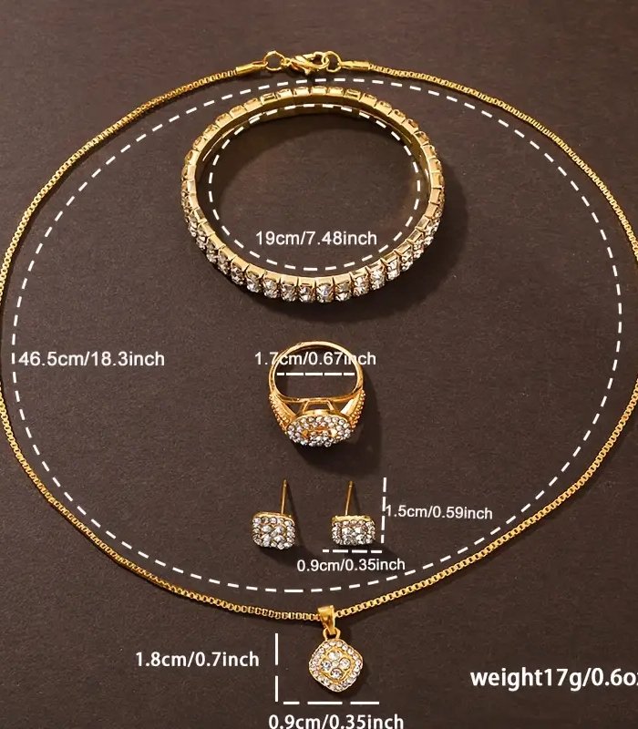 Crafted from durable zinc alloy, the golden-tone quartz watch is built for long-lasting style. The round case and Roman numeral dial provide a classic touch, while the bracelet strap ensures comfort. In addition, the jewelry pieces included in this set—necklace, bracelet, earrings, ring, and pendant—are adorned with gemstone details, giving a luxurious sparkle suitable for daily wear or special occasions.