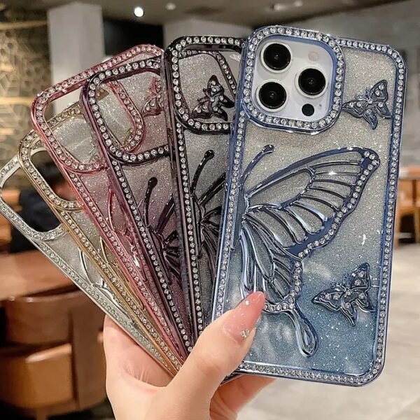 Shiny Diamond 3D Butterfly Phone Case for iPhone 13/14/15/16 – Elegant TPU Soft Cover for Women