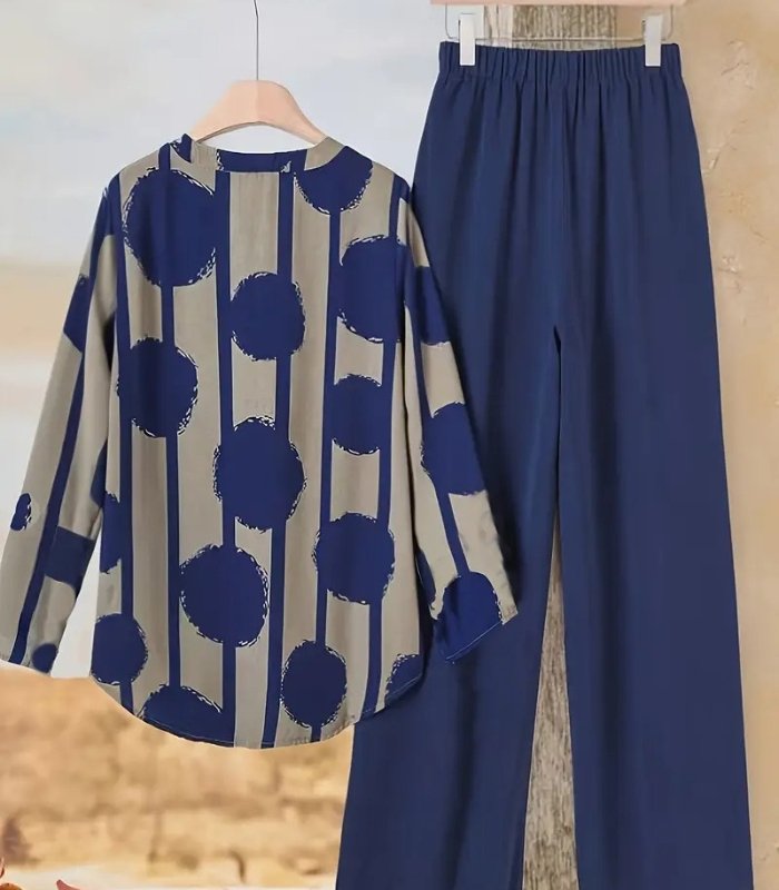 Golden Polka Dot Floral Two-Piece Set – Stylish Summer Outfit with Casual Long Pants for Holidays and Everyday Wear