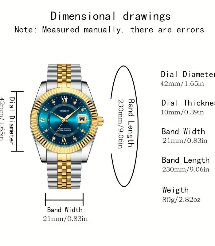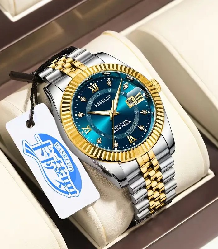 The Men’s Luxury Stainless Steel Luminous Watch by KASRLUO is crafted for those who value elegance, durability, and precision. Featuring a striking blue dial with golden accents, this watch makes a bold statement of sophistication. The luminous hands and hour markers allow you to read the time clearly in low light, ensuring both beauty and functionality in one piece.