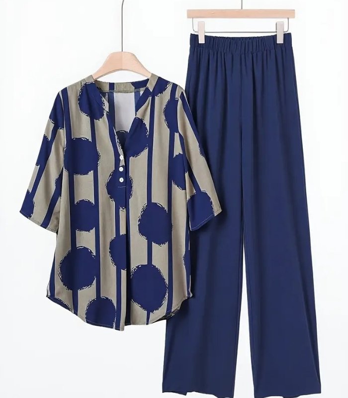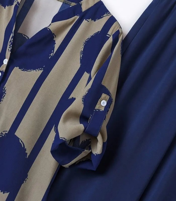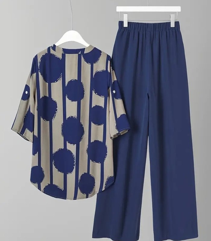 Bring elegance and comfort together with this navy blue polka dot two-piece set. It features a stylish V-neck button-up top and wide-leg pants — a perfect outfit for both casual days and formal events. Lightweight, versatile, and flattering for every season.