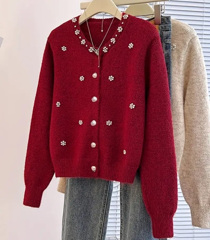 Women’s Red Floral-Accent Cardigan – Lightweight Button-Up Sweater with White Embroidered Details, Crew Neck, Long Sleeves, Perfect for Casual Fall & Winter Wear