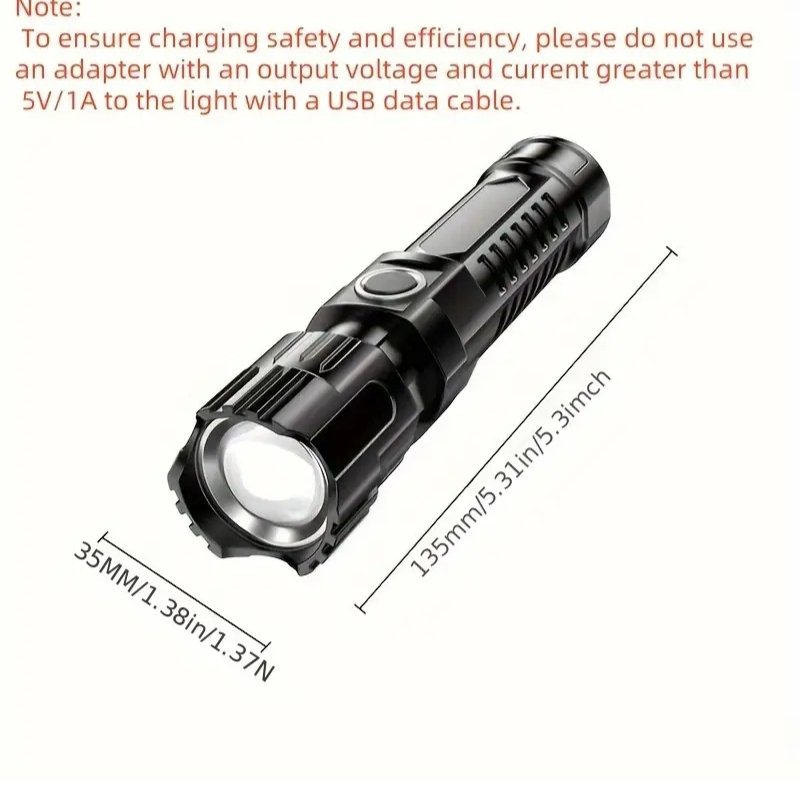 High-performance LED flashlight featuring 150 lumens brightness, 200-meter range, telescopic zoom, and a rechargeable 800mAh USB battery—perfect for camping, emergencies, and daily use.