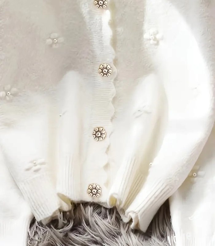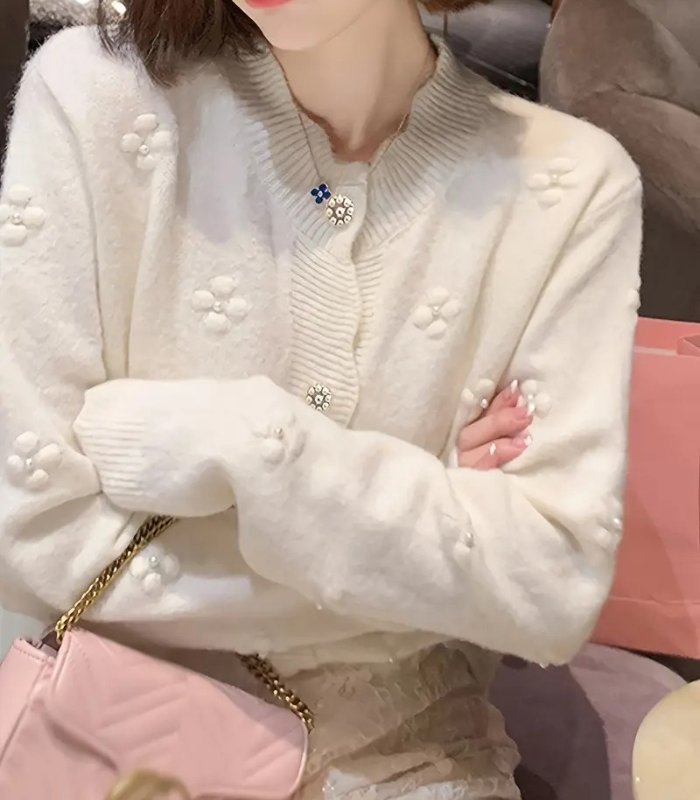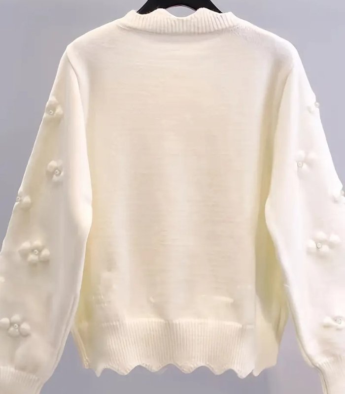 The standout feature is the 3D floral embellishments, which add a feminine and unique touch to the classic knit design. The round neck and long sleeves offer a timeless silhouette, while the wavy hem and button accents bring subtle elegance to your outfit.