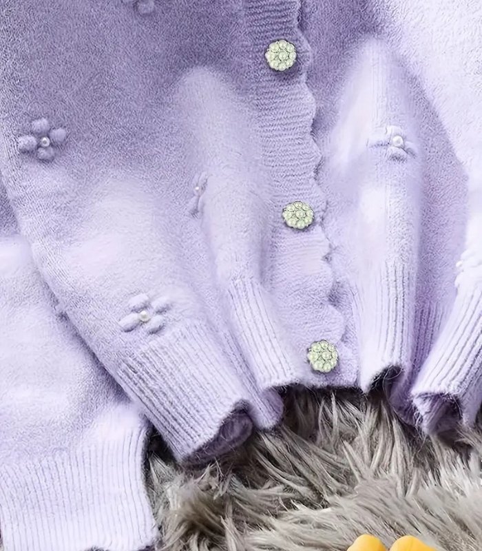Stay stylish and cozy with this Women’s Elegant Knit Cardigan. Featuring a classic round neck, long sleeves, 3D floral embellishments, wavy hem, and subtle button accents, this solid-color sweater is perfect for layering in autumn and winter