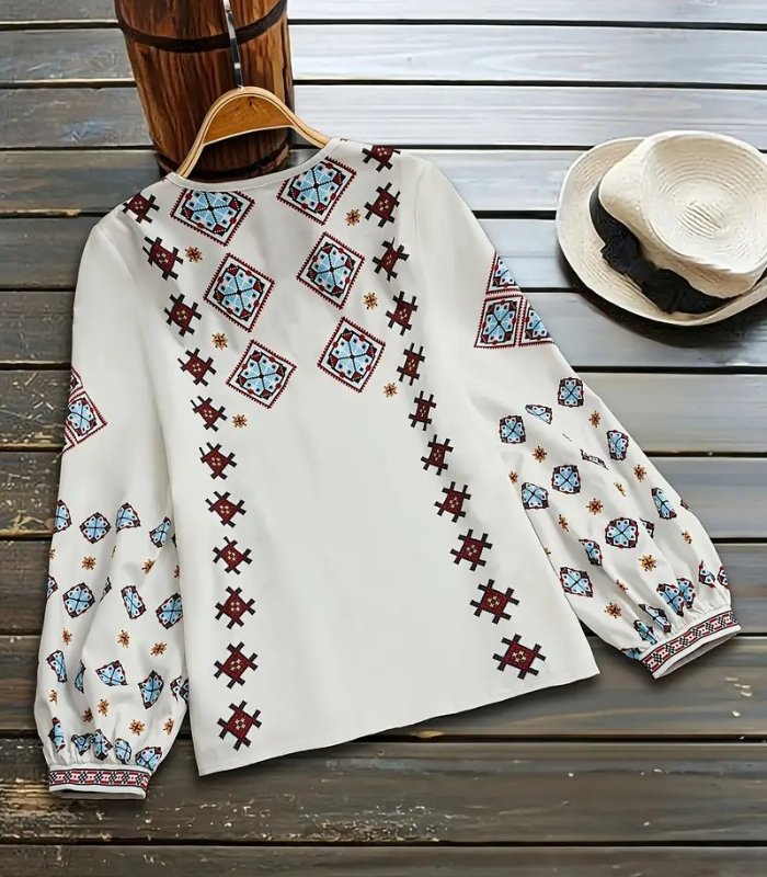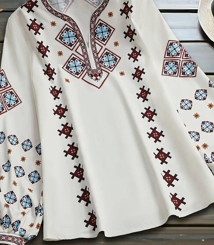 Women’s Ethnic Floral V-Neck Blouse – Lantern Sleeves, Lightweight Fabric & Casual Vacation Style | All-Season Elegant Top