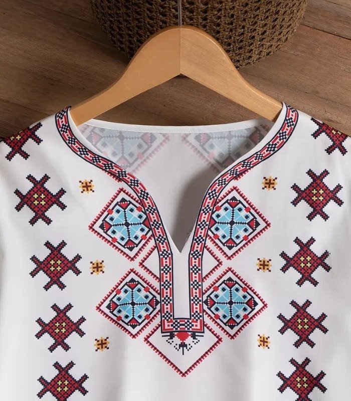 Add effortless charm to your wardrobe with this ethnic floral V-neck blouse. Designed with soft lantern sleeves and a lightweight, breathable fabric, it’s perfect for vacations, brunches, or casual days when you want comfort with style.