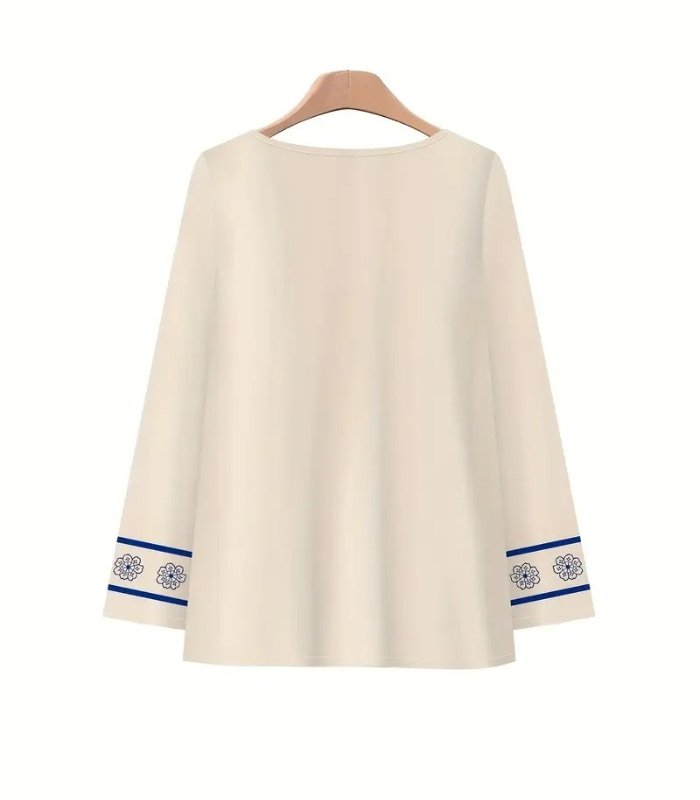 The long-sleeve floral blouse features a flattering fit with a soft neckline, offering a graceful look for day or evening wear. Paired with flowy wide-leg pants, this outfit delivers a beautifully balanced silhouette that’s both stylish and comfortable.