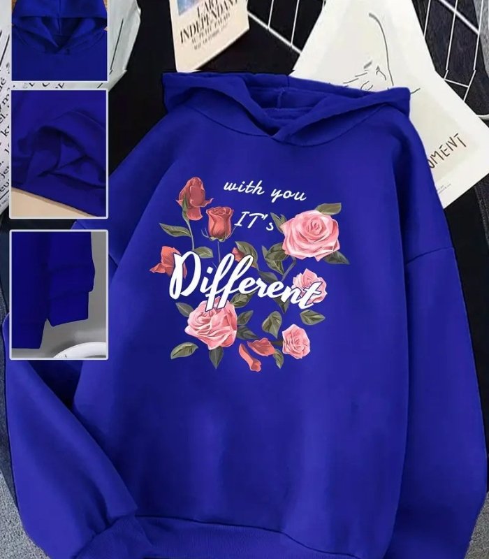 The Women’s Pink “It’s Different” Floral Hoodie combines comfort, charm, and modern streetwear style. Made from soft, high-quality fabric, this long-sleeve pullover offers warmth and breathability — ideal for cool fall and winter days. The hoodie features a beautiful floral print paired with the statement text “With You,” adding a touch of positivity and unique style to your casual wardrobe.