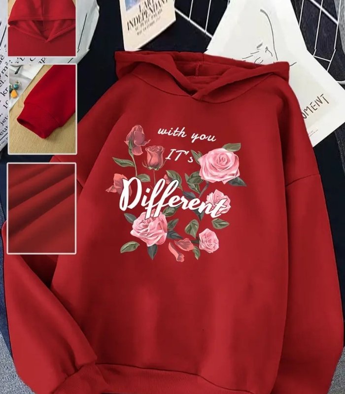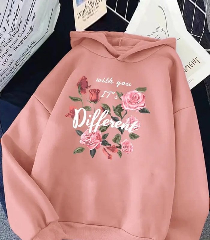 Women’s Pink “It’s Different” Floral Hoodie – Soft Long-Sleeve Pullover Featuring “With You” Print | Trendy, Cozy & Stylish Choice for Fall and Winter Casual Wear