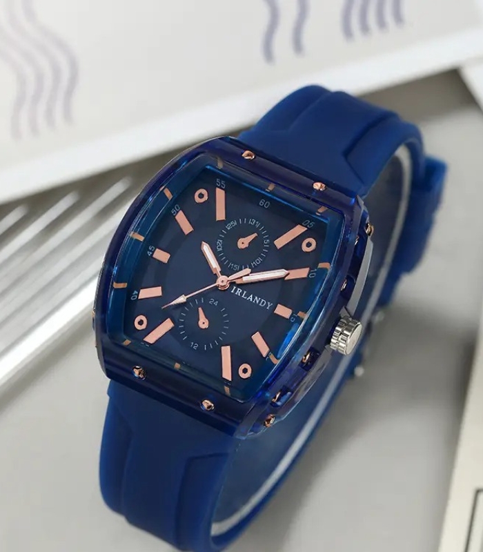 A stylish men’s quartz watch designed with a minimalist dial and a casual sports-inspired college style