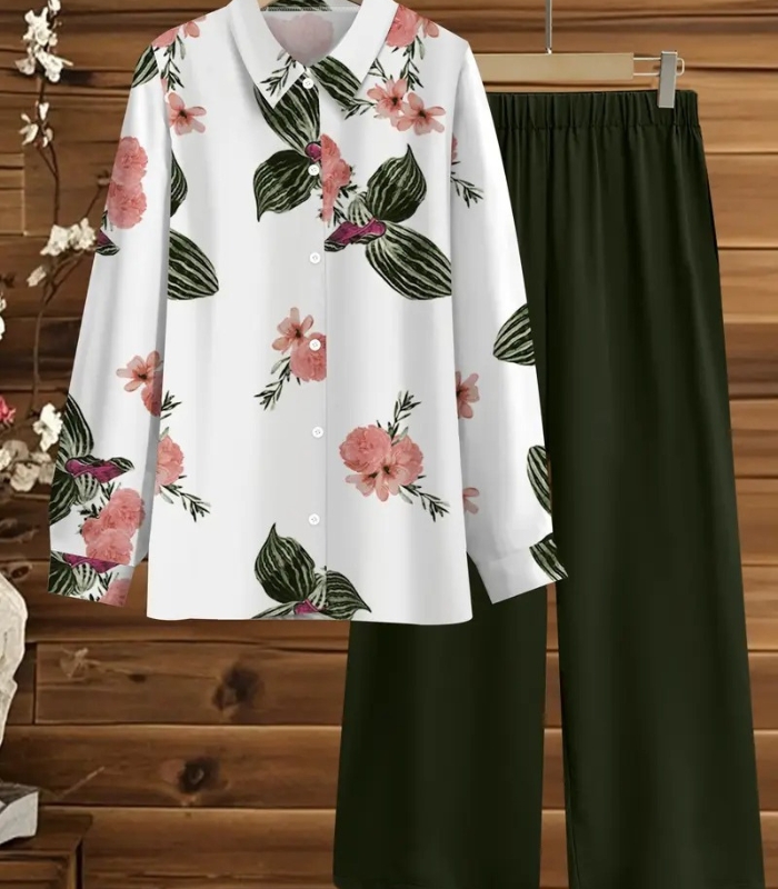 Women’s Casual Two-Piece Set – Long-Sleeve Plant Print Shirt with Solid Trousers and Handy Pockets for Spring and Summer