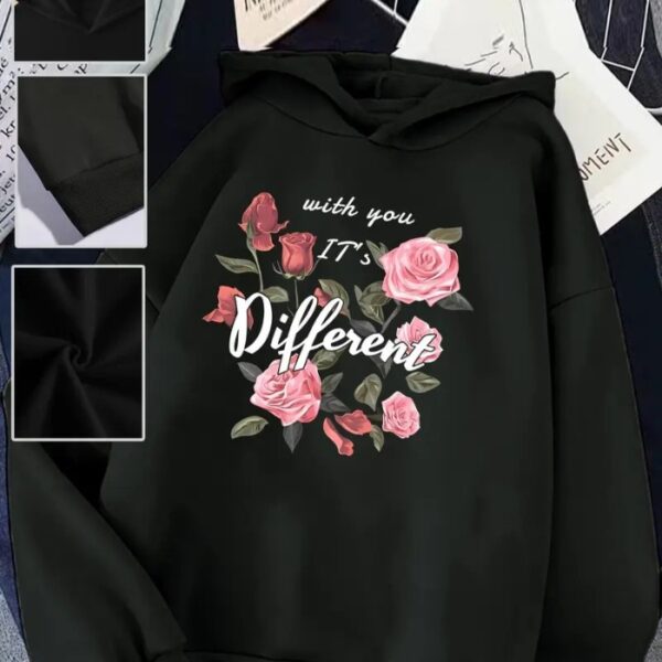 Women’s Pink “It’s Different” Floral Hoodie – Soft Long-Sleeve Pullover Featuring “With You” Print | Trendy, Cozy & Stylish Choice for Fall and Winter Casual Wear