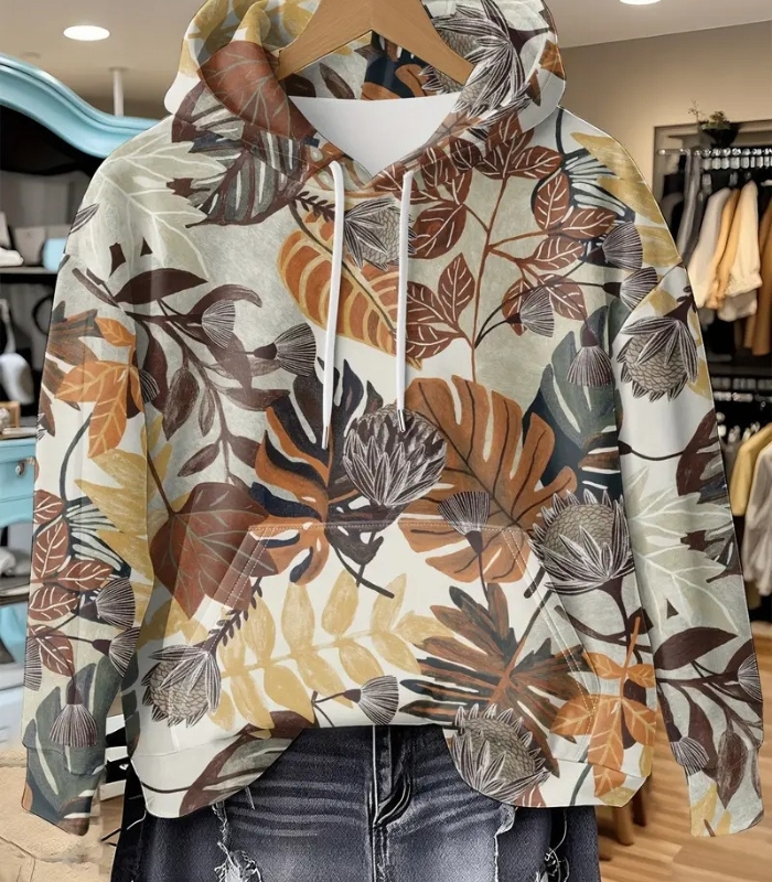 Women’s Oversized Botanical Leaf Print Hoodie – Cozy Full-Zip Hooded Sweatshirt with Earthy Tones | Loose-Fit Casual Outerwear for Fall & Winter