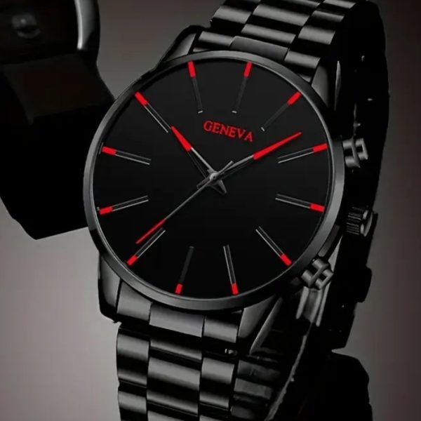 Men’s Black Quartz Watch – Sleek Stainless Steel Band, Zinc Alloy Case, Red Hands, Easy-Read Dial, Battery-Powered Movement, Perfect for Business Casual Style