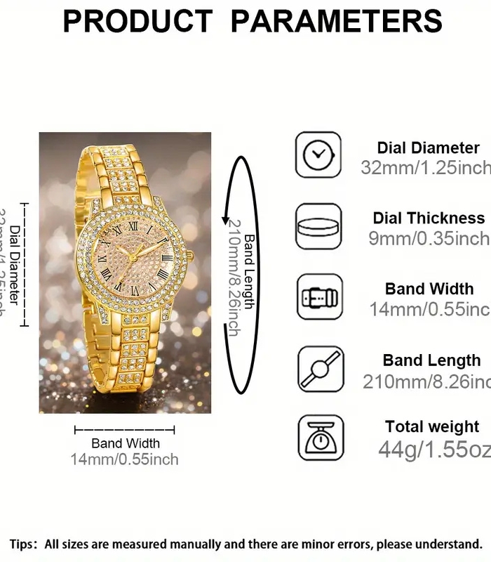 In conclusion, the 2pcs Women’s Quartz Watches set delivers sparkle, comfort, and versatile style, making it a must-have for every woman’s accessory collection.