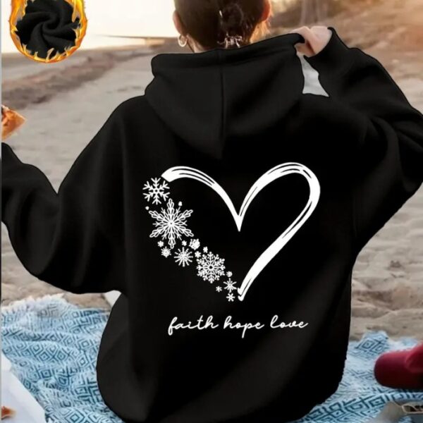 Women’s Snowflake & Heart Print Hoodie – “Faith Hope Love” Back Design | Cozy Long-Sleeve Sweatshirt with Front Pocket | Comfortable All-Season Casual Wear for Women