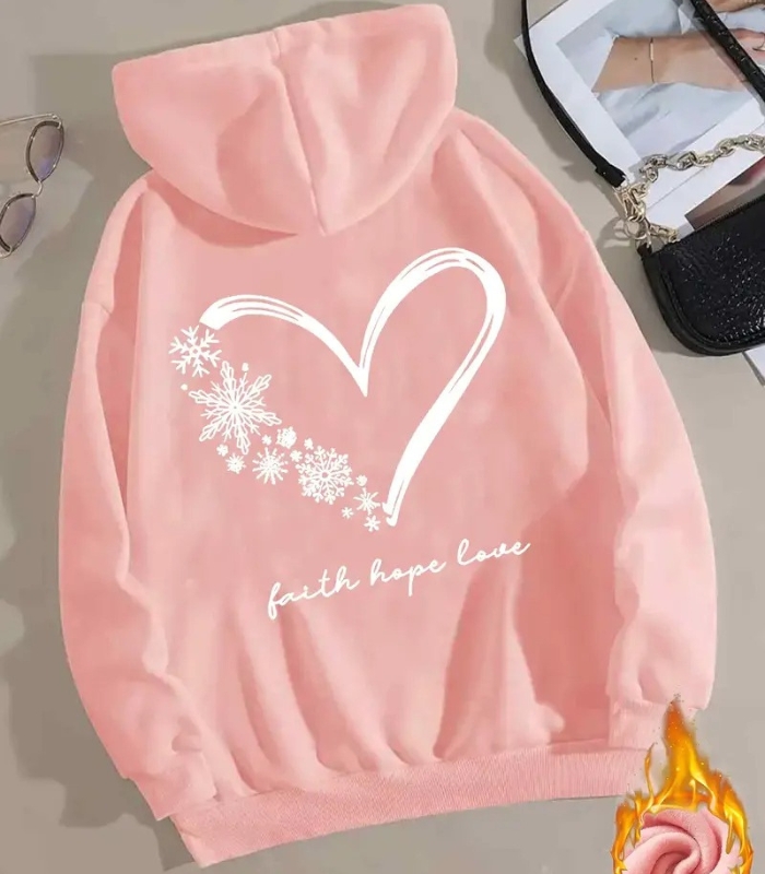 Stay stylish and warm in this Faith Hope Love hoodie for women. Designed with elegant snowflake and heart prints, this cozy sweatshirt brings positivity and comfort to your everyday look. Perfect for casual wear, traveling, or relaxing at home during any season.