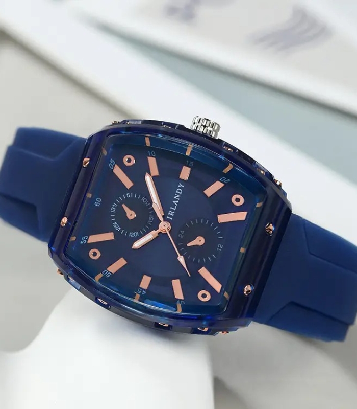 Men’s Luxury Quartz Watch featuring a bold square blue dial, golden hands, and a multi-pointer chronograph with 24H display. Lightweight yet durable, it’s designed for both elegance and everyday comfort.