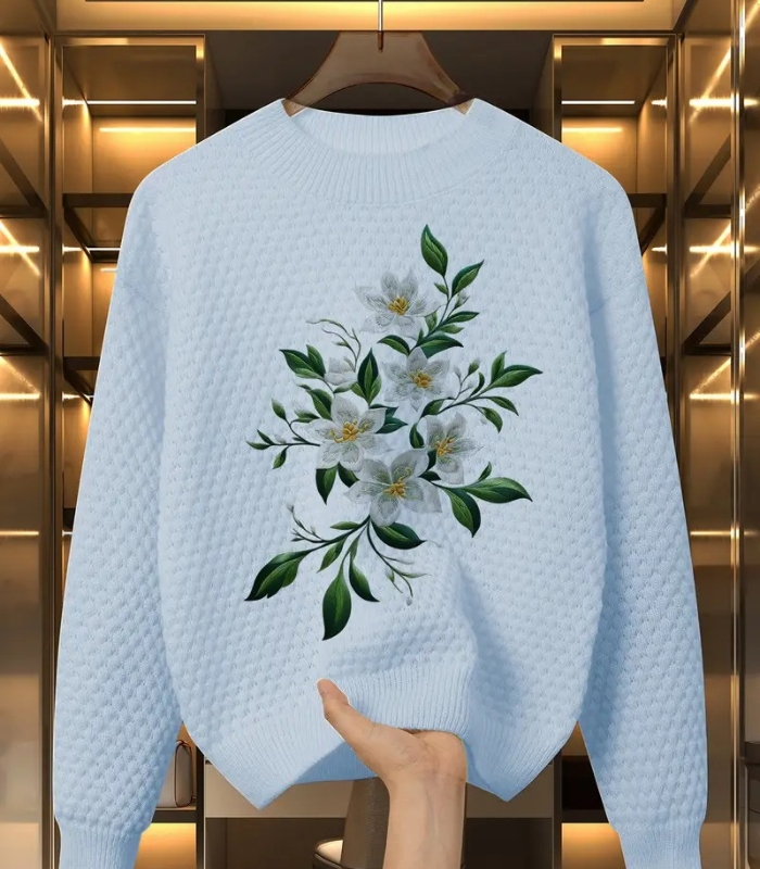 The white and green leaf-inspired design adds a graceful seasonal touch, while the round neckline keeps the look effortlessly classic. Whether you’re heading to the office, relaxing at home, or dressing up for a winter outing, this sweater adapts beautifully to every occasion.