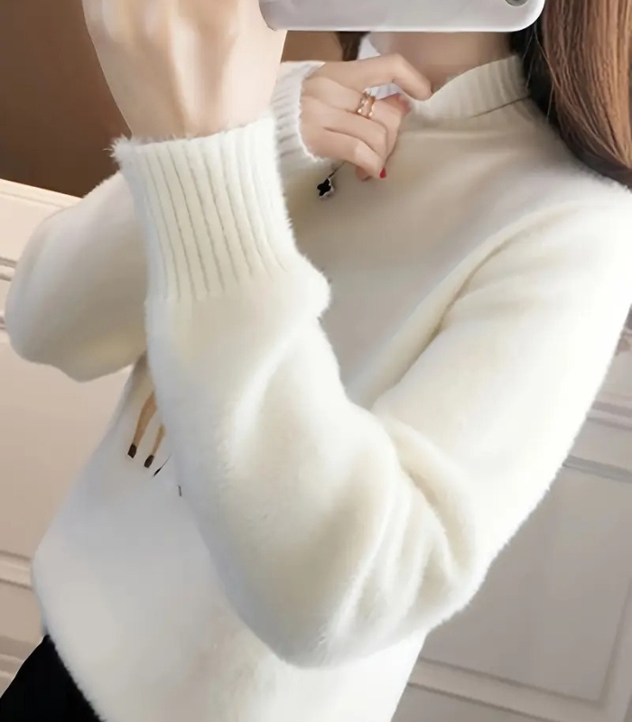 Women’s Christmas Sweater – Elegant Half-Turtleneck Pullover with Embroidered Deer Design for Cozy Winter Style