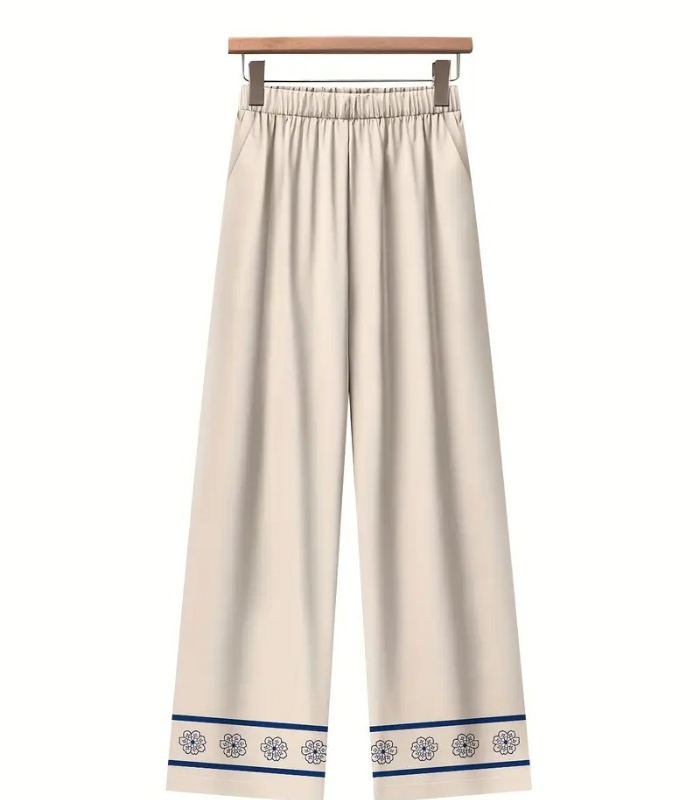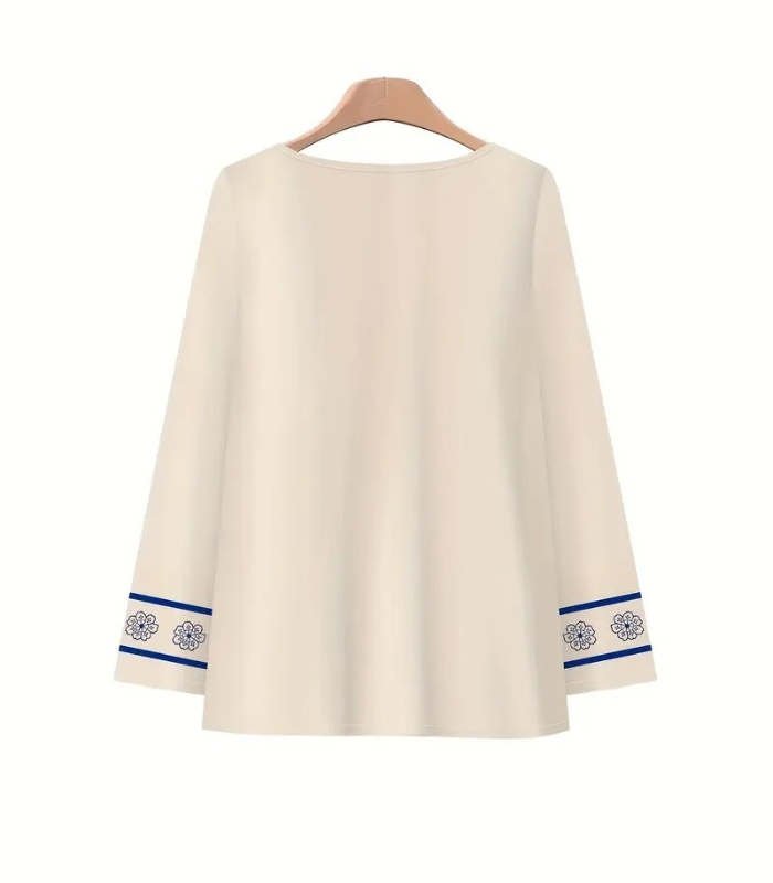 The long-sleeve floral blouse features a flattering fit with a soft neckline, offering a graceful look for day or evening wear. Paired with flowy wide-leg pants, this outfit delivers a beautifully balanced silhouette that’s both stylish and comfortable.