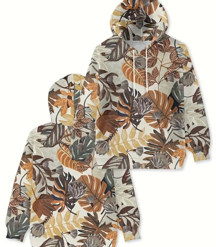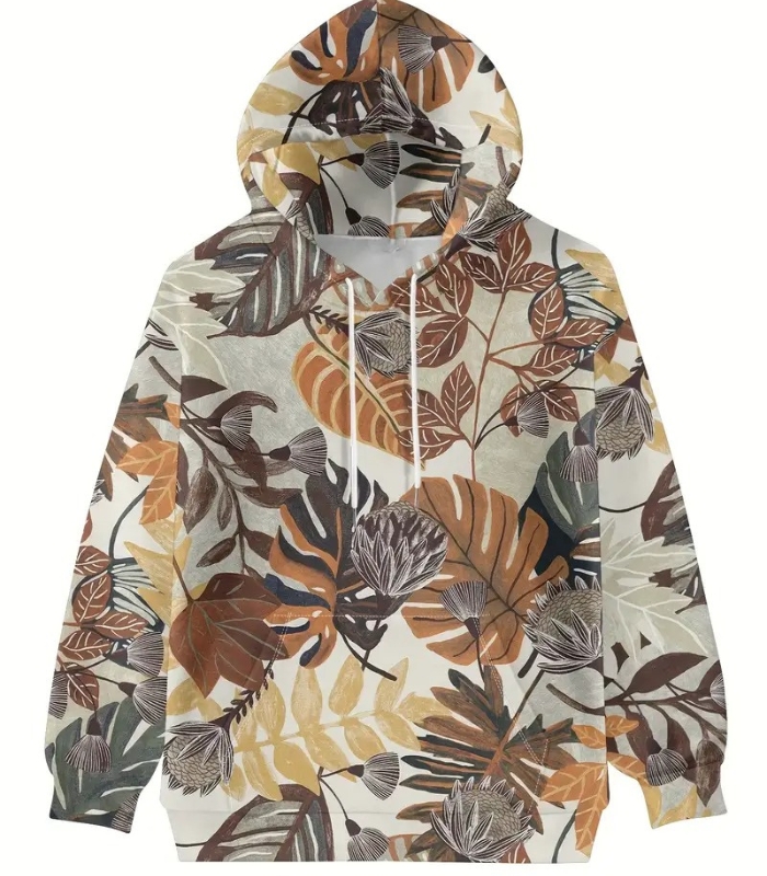 This hoodie blends comfort and modern fashion with an artistic touch. The botanical leaf print adds a natural vibe to your casual look, while the oversized silhouette offers unbeatable coziness. Whether you pair it with jeans or leggings, it’s your go-to outerwear for all-season style.